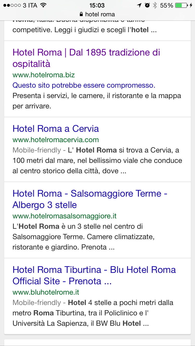 Praticamente abbiamo per la maggior parte Hotel non su Roma, non ottimizzati mobile, e addirittura uno con alert anche di exploit.