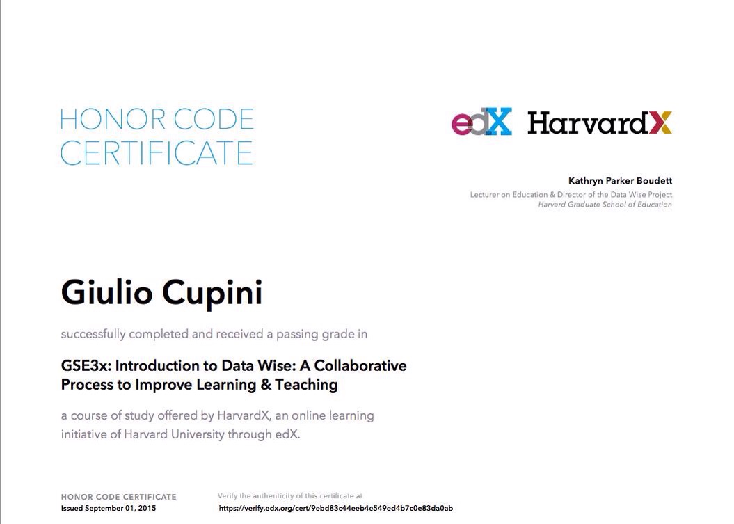 Io mi sono iscritto al corso “Data Wise, A Collaborative Process to Improve Learning & Teaching”, per imparare meglio come estrapolare dati e fatti, capire i progetti per poi analizzarli e raccontarli. E’ stato davvero interessante, e oggi ho superato l’ultimo esame!